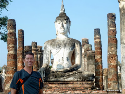 Le chant des oiseaux tropicaux nous réveille en musique ce matin. Il est un peu tôt pour se lever nous flânerons donc au lit en faisant du Skype. Vers 8 :00 nous quittons notre lit douillet pour aller visiter les ruines de Sukhothai, à treize kilomètres de la ville. Il nous est difficile de trouver une gargote à soupe, serait-ce le début de la fin pour les soupes à déjeuner? Nous nous rabattrons donc sur un bouillon avec un peu de viande dedans. Pas de nouilles ni de riz, la faim va vite nous prendre. Les treize kilomètres se pédalent rapidement, pas une montée que du plat. Le site des ruines se divise en trois parties, où il faut payer un frais à chacune des entrées. Dans le temps il existait une passe pour les trois parties et qui était valide trente jours. Le gouvernement voyant qu’il perdait de l’argent a annulé cette passe. Le site principal, qui est à l’intérieur des murs est le plus impressionnant et le mieux conservé, c’est celui-là que nous visiterons en premier.